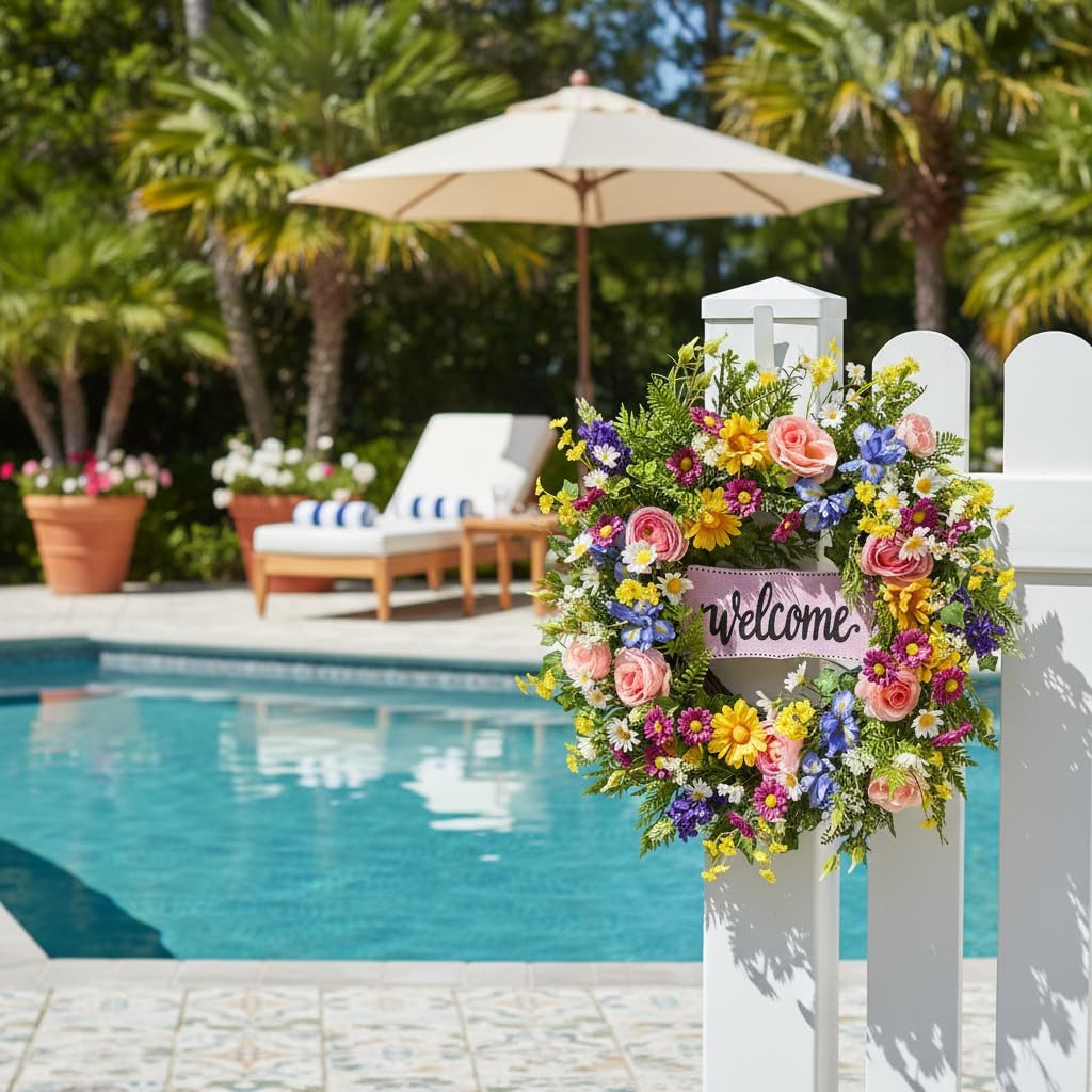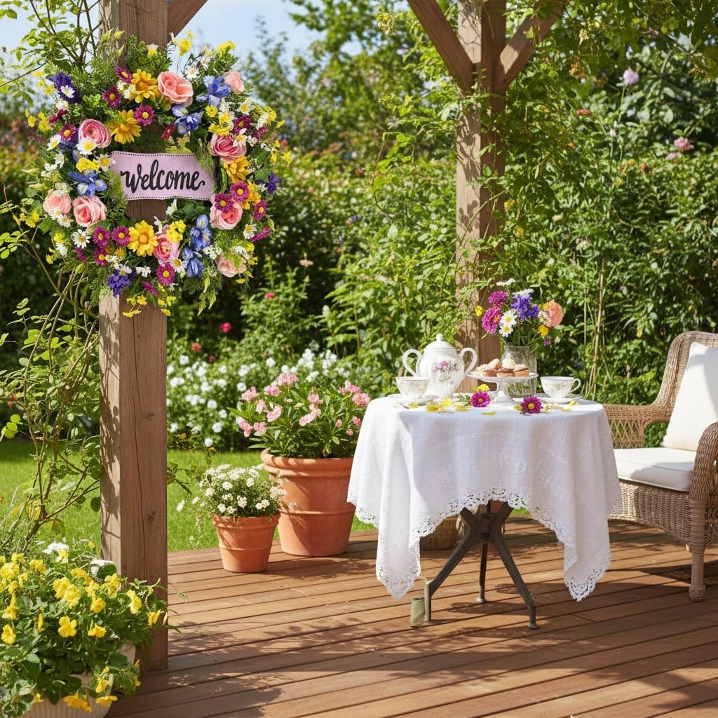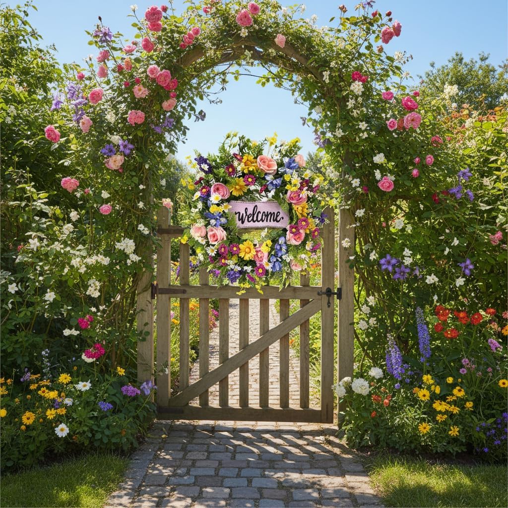 Let Your Front Door Bloom with the Joyful Colors of a Wildflower Meadow! Instantly brighten your home and extend a cheerful greeting to all who visit with the breathtaking beauty of the Lnymura Colorful Welcome Wreath. This magnificent 22-inch creation is a vibrant, overflowing garden, designed to bring the happy spirit of a sun-drenched meadow right to your doorstep. A Masterpiece of Lifelike Blooms: This wreath is a stunning composition of nature's finest. Lush pink roses, cheerful yellow daisies, elegant blue irises, and pretty pink ranunculus are artfully blended with a variety of other wildflowers and rich, ferny greens. The explosion of color is joyful, uplifting, and incredibly lifelike. A Heartfelt Welcome: At its center, a charming pink sign offers a warm "welcome" to all. It’s the perfect way to add a touch of personality and hospitality to your home. Hang this masterpiece on your front door, in your entryway, or anywhere that needs a splash of vibrant, natural beauty.