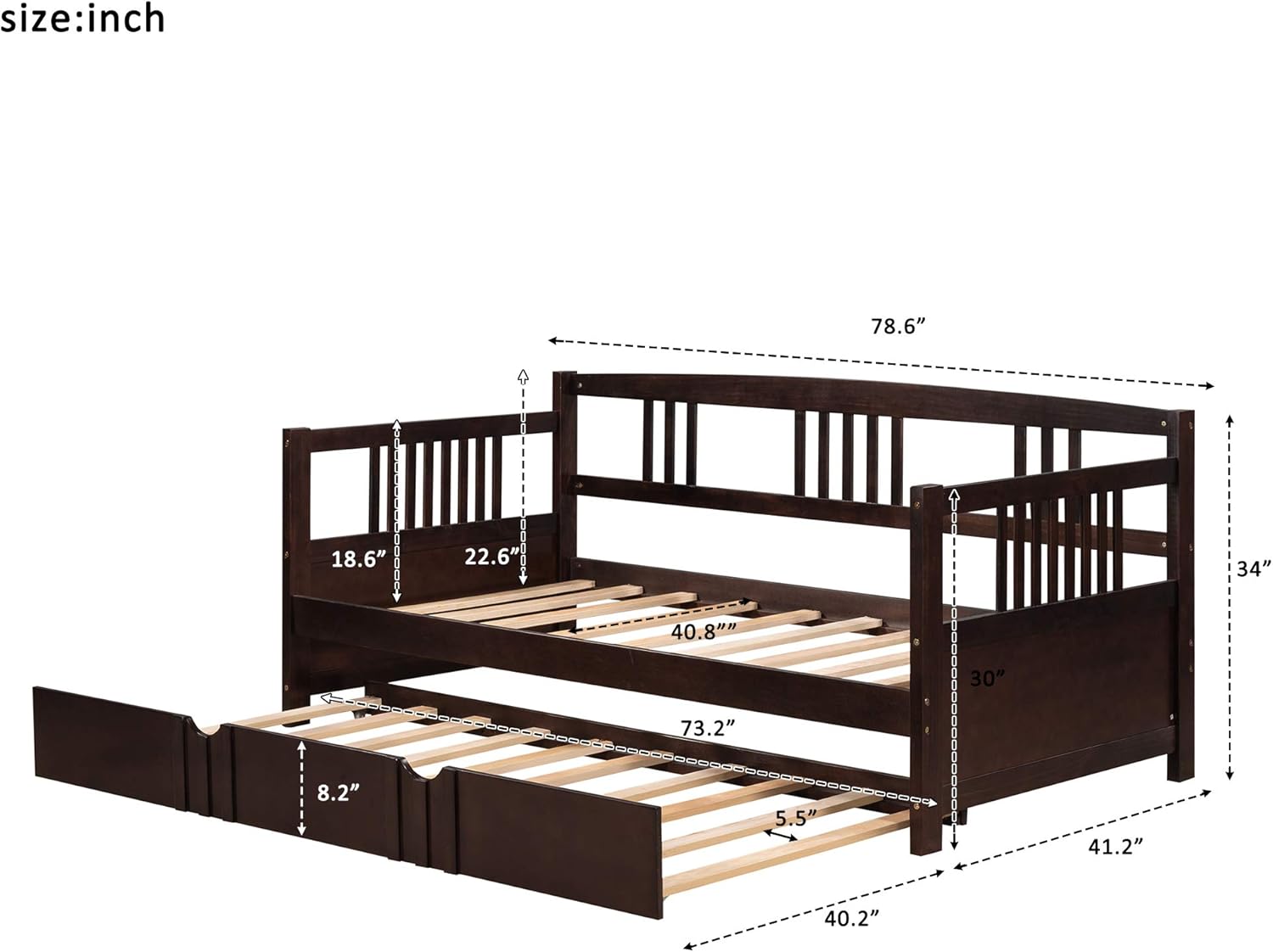 Bellemave Twin Size Daybed, Twin Daybed with Trundle Bed, Twin Wood Daybed Frame with a Trundle for Kids Boys Girls Teens Adults, No Box Spring Needed, Espresso Product Description: Overall Product Dimension: 78.2"L x 42.3"W x 35.4"H Number of Package: 1 Overall Product Weight: 78.3lbs Weight Capacity: Upper bed: 300LBS/ Trundle bed: 300LBS Recommended Mattress Thickness: Upper bed: 8" /Trundle bed: 6" Specifications: Product Type: Daybed with Trundle Size: Twin Color: Espresso Product material: Plywood+Pinewood Total product net weight: 78.3lbs Number of Slats: Upper bed: 10 /Trundle bed: 7 Country of Origin: Vietnam Notes: Manual me asurement has been used,there may be some reasonable error. All the pictures are taken by actual samples, slight chromatic aberration may occur due to lighting or display.