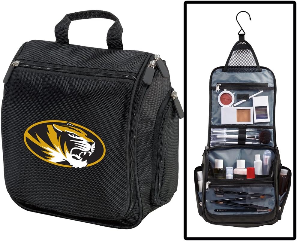 Officially Licensed Mizzou Toiletry Bag is a top University of Missouri gift for a man or a woman! An essential accessory for every traveler, the unique and useful Mizzou toiletry bag or Mizzou Shaving Kit features see-through pockets to view toiletries and accessories. Lots of secure zippered pockets! Perfect as a Mizzou dopp kit or University of Missouri shaving bag for men. This hanging University of Missouri travel organizer bag features a foldout hook that makes it easy to hang on a door or towel bar. 10h x 9.5w x 4d These are Officially Licensed Mizzou Toiletry Bags & University of Missouri Shaving Kits for Men - Up to 12% Returned To Support University of Missouri Programs!