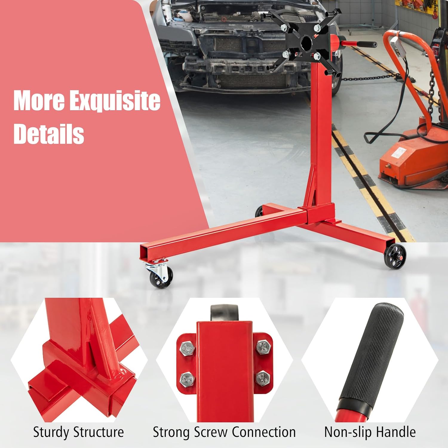 Are you looking for an engine stand that offers great convenience and efficiency in your engine maintenance and repair tasks? Our innovative stand features a 360° rotating head, enabling easy access to all engine parts without the need for repositioning. With 4 adjustable arms for customizable positioning, this stand is perfect for various maintenance and repair tasks. Thanks to the premium metal material and strong screw connections, the heavy-duty frame can support weights of up to 750 lbs. Besides, with the durable metal casters, you can enjoy easy movement around your workspace, Assembly is a breeze with included instructions and hardware, while the waterproof and smooth surface guarantees easy maintenance with just a simple wipe-down. Hence, this stand ideal for both home garage use and professional workshops. Features: Secure lock For fixing and adjusting the handle The lever handle with non-slip design allows for easy adjustment Suitable for garages, repair shops, and factory settings Heavy-duty frame supports weights of up to 750 lbs 4 flexible mounting arms ensure easy positioning and fit most engines Waterproof and smooth surface for easy maintenance Equipped with durable wheels for easy movement Specifications: Color: Red, Black Material: Metal Overall Dimension: 32.5” x 30.5” x 34” Head Dimension(without arm): 10” x 6” Net Weight: 47.2Ibs Load Capacity: 750 lbs Package includes: 1 x Engine Stand 1 x User Guide Why you choose our engine stand? √ Experience effortless access with the 360° rotating head design √ Versatile use for both home garage and professional workshop environments