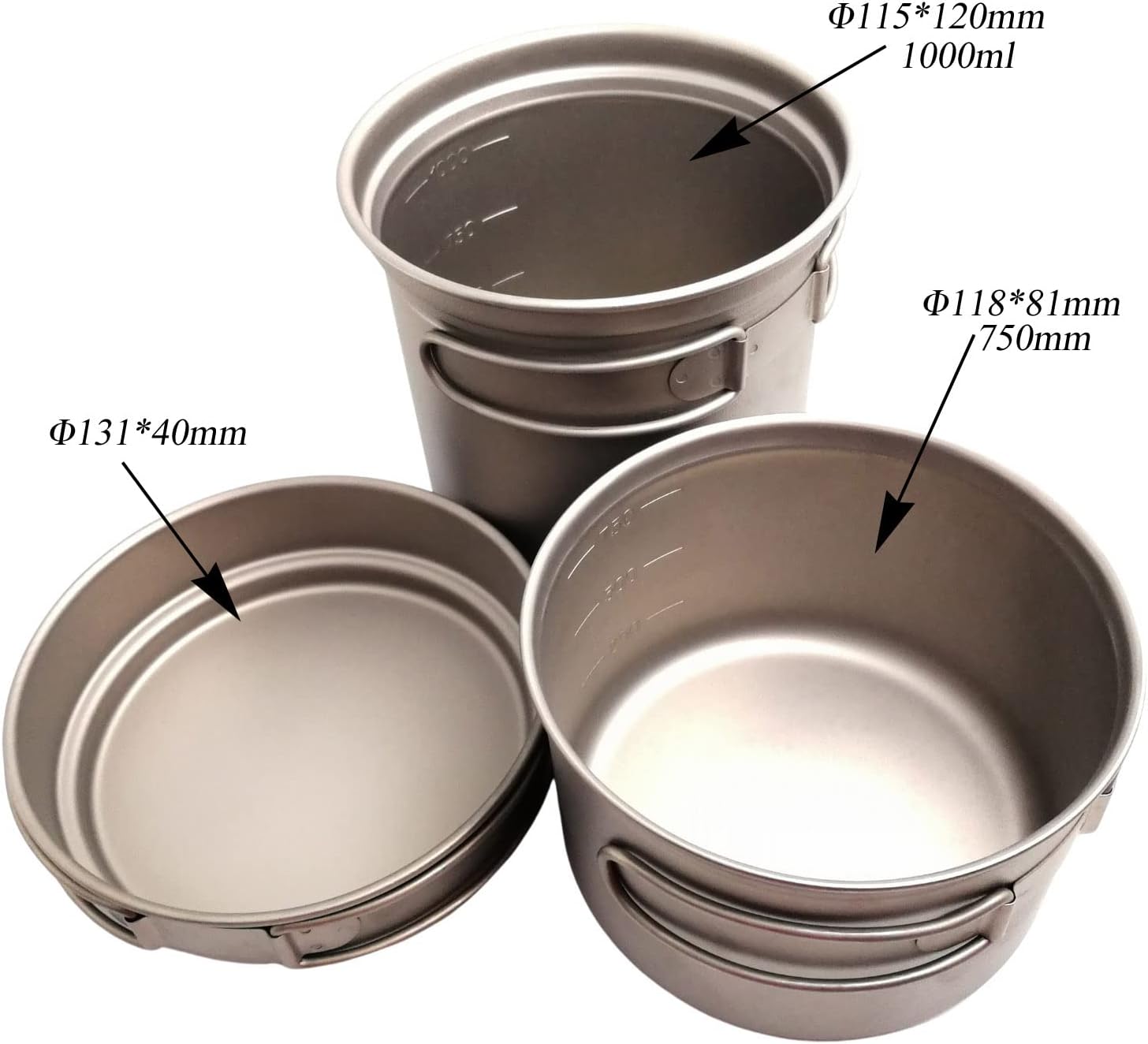RISON-Titanium has focused on titanium products for ten years. 3 Titanium Pot Camping Set: Titanium Mess kit with Folding Handle for Outdoor Camping It is not only just good for camping,as it comes with a drawstring bag that makes it easy to carry during travel,office or keep it in your car or even to carry with you for picnic with the family. Product details: Brand: RISON-Titanium Material: titanium Packaged: 1000ml Pot*1 750ml Pot*1 500ml Pot*1 Storage Bag*1 Applied to: Outdoor, Camping, Picnic, Backpacking, Hiking, Travel, Home use ect. About Titanium: 1. Titanium tableware cannot be burnt without anything inside it, otherwise the titanium tableware will burn black; 2. Do not put it together with porcelain, otherwise the porcelain will leave inevitable scratches; 3. Titanium products have good thermal conductivity, so after heating, please stand for 3-5 minutes before touching to avoid scalding; Note: 1. Dishwasher safe. 2. Please wash before use.