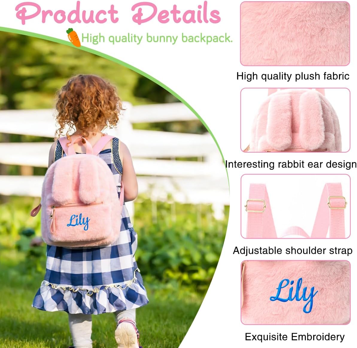 Give your little one a backpack as unique as she is! Our Personalized Plush Bunny Ear Backpack combines irresistible cuteness with practical design. Made from ultra-soft, child-safe plush fabric, it’s gentle on skin and easy to clean. Customize it with her name or a sweet message in the embroidery color of your choice—available in charming pink, neutral beige, or classic black. Measuring 10.2” x 8.6”, it’s the perfect size for toddlers and young kids, with adjustable straps and a lightweight design for all-day comfort. Spacious main bag keep snacks, toys, and daily essentials neatly stowed, while the adorable bunny ears add a fun, playful touch that turns every outing into a little adventure. Whether it’s a birthday, Easter gift, holiday surprise, or back-to-school treat, this backpack is more than just a bag—it’s a personalized treasure she’ll love to carry. Order today and create a gift she’ll remember!